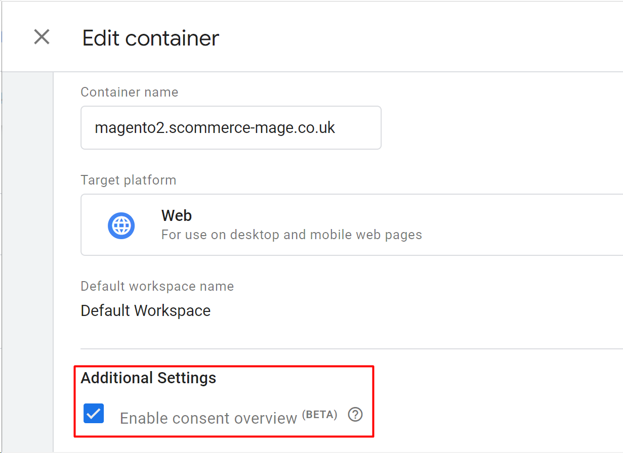 - Open the container that is connected with our GTM module, go to “Admin”->“Container Settings” and enable consent overview present in the additional settings.