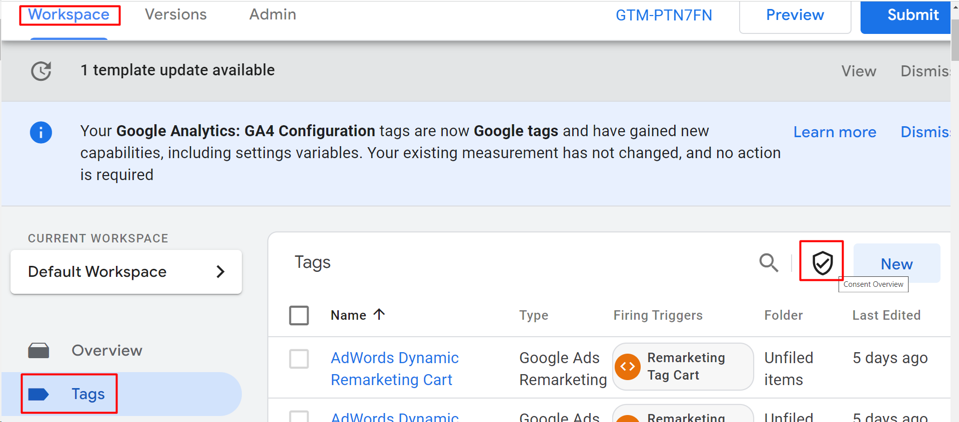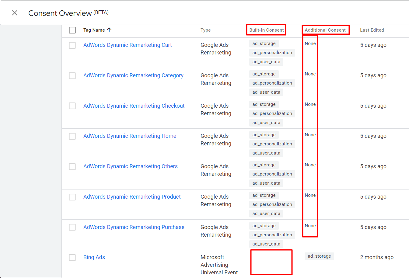 - Go to “Workspace”->”Tags” -> click on “Consent Overview” (shield) and set up consent for each tag. Make sure to select “No additional consent required” for Tags that already have “Built-In Consent”. These tags are generally Google related tags.