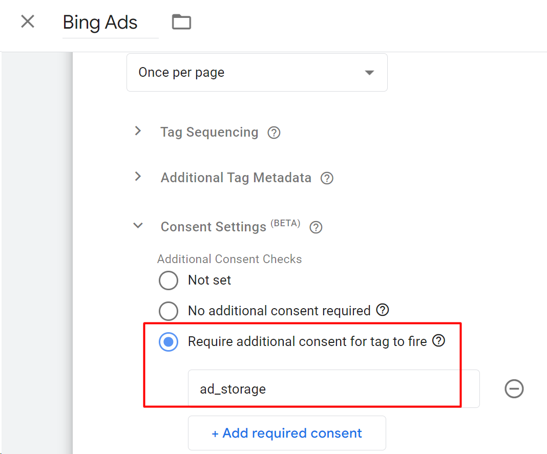 2a. In order to add “Additional Consent”, click on the tag name and go to ”Consent Settings” and choose “Require additional consent for tag to fire” and add the consent param that you want as “Additional Consent”. If cookies related to the consent parameter that is chosen as an additional consent are not accepted then that tag would not fire.
