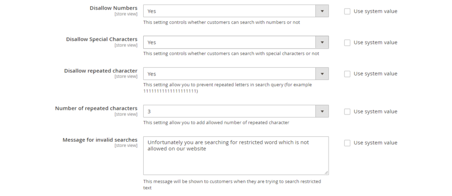 Disallow repeated character– Select "no" to allow customers to search with repeated characters and "yes" to disallow. It prevents repeated letters in the search query.