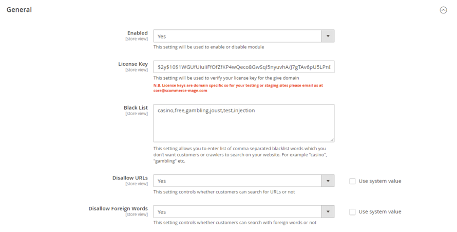 License Key – Please add the license for the extension which is provided in the order confirmation email. Please note license keys are site URL specific. If you require license keys for dev/staging sites then please email us at support@scommerce-mage.com.