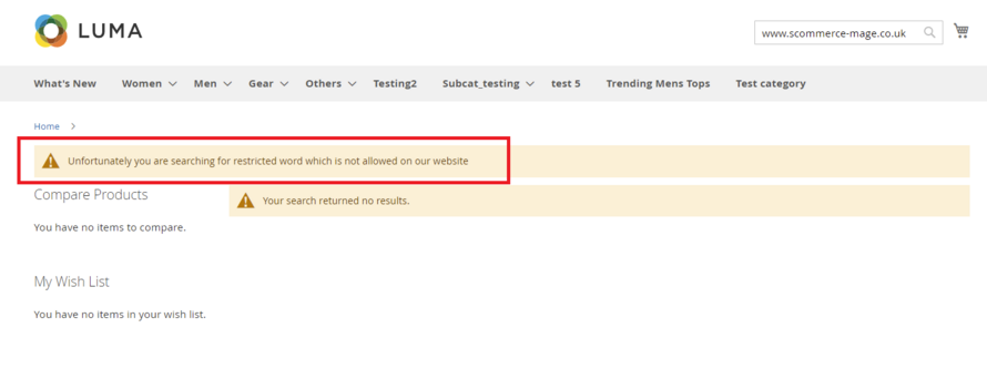 When an user searches with diallowed character then the warning message appears on the frontend as shown below:-