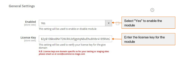 - License Key - Please add the license for the extension which is provided in the order confirmation email. Please note license keys are site URL specific. If you require license keys for dev/staging sites then please email us at support@scommerce-mage.com.