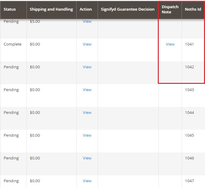 Noths Order Import - You can view imported Noths order(s) from Admin > Sales> Orders. This grid will have "Dispatch Note " and "Noths Id".