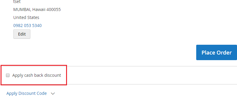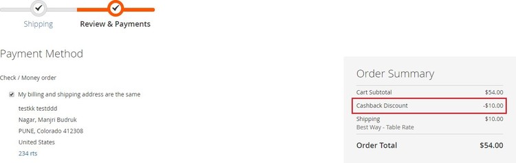 - Applied Cashback Discount on the Checkout Page - You can see the applied cash back discount on the checkout page under "Order Summary" section.