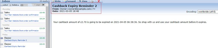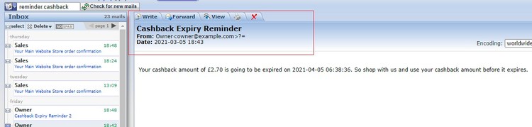 - Cashback Expiry Reminder Email - When you enable the "Cash Back Reminder" from Admin > Stores > Configuration > Scommerce Configuration > Cash Back > Cash Back Reminder > Enable - "Yes", it sends an expiry reminder email to customers before the period of the discount expired.