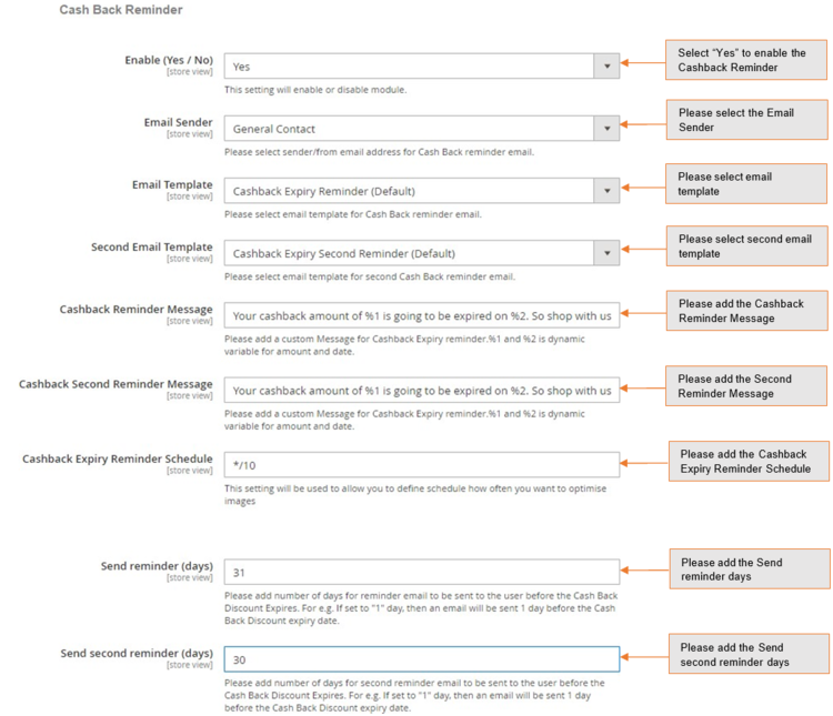 Cashback Expiry Reminder Schedule – Please define how often you want to run cron for the cash back reminder email.