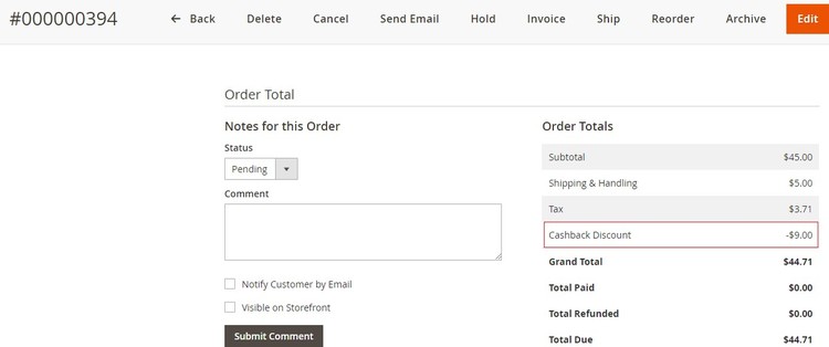 Applied Cashback Details on the Order View Page - You can view the applied cashback discount at Admin > Sales > Orders > select Order > View.