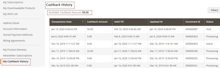 - Cashback Discount Details on the Front-end - My Account Section - You can view cash back details on the front-end from My Account > My Cashback History.
