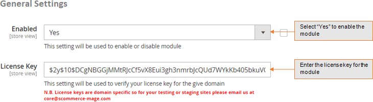 - License Key - Please add the license for the extension which is provided in the order confirmation email. Please note license keys are site URL specific. If you require license keys for dev/staging sites then please email us at support@scommerce-mage.com.