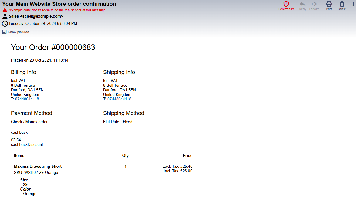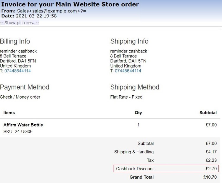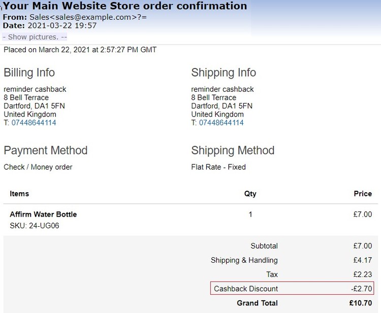 - Order Confirmation Email – You can see the applied cashback discount on the order confirmation and invoice emails.