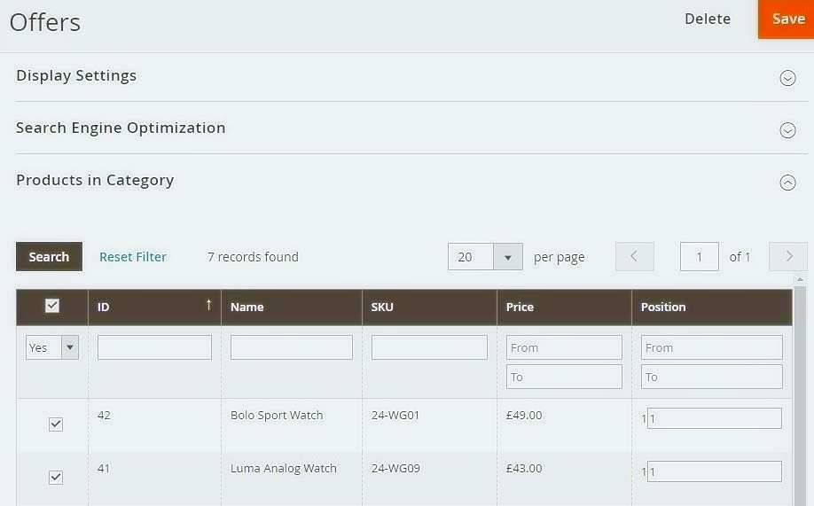 - Products Assigned to Sale Category in the Back-end - You can see the Sale Products in the back-end under "Sale/Offers" categories, from Admin > Catalog > Categories > Select Category "Offers" > Click on "Products in category" .
