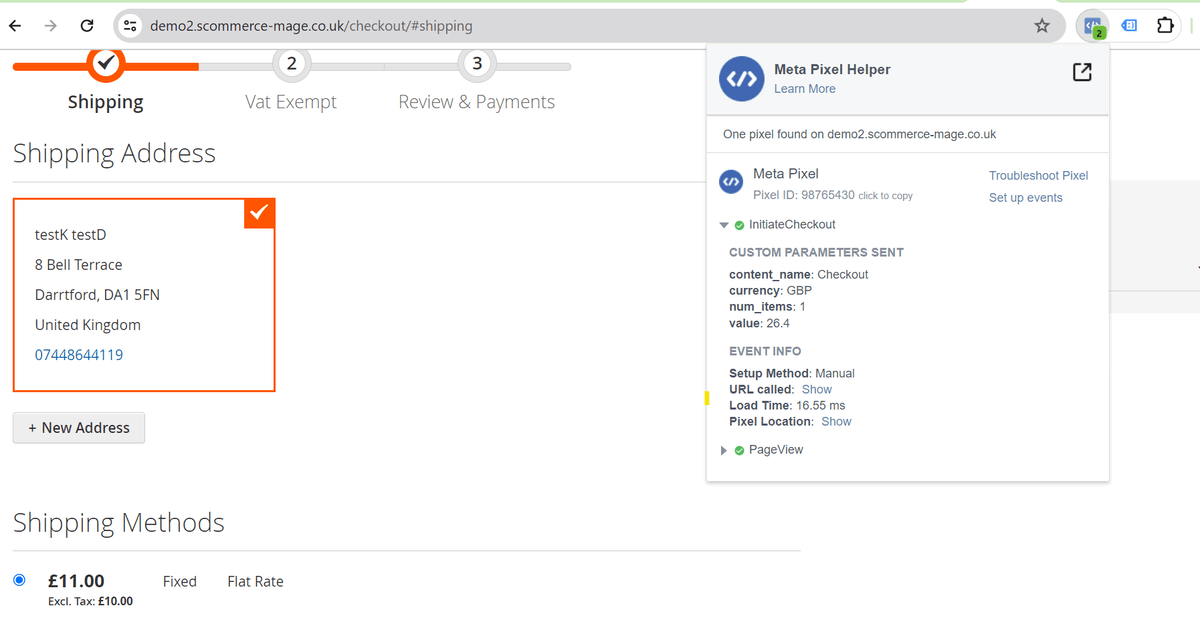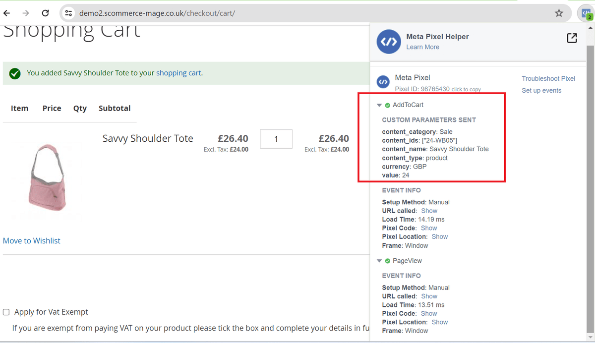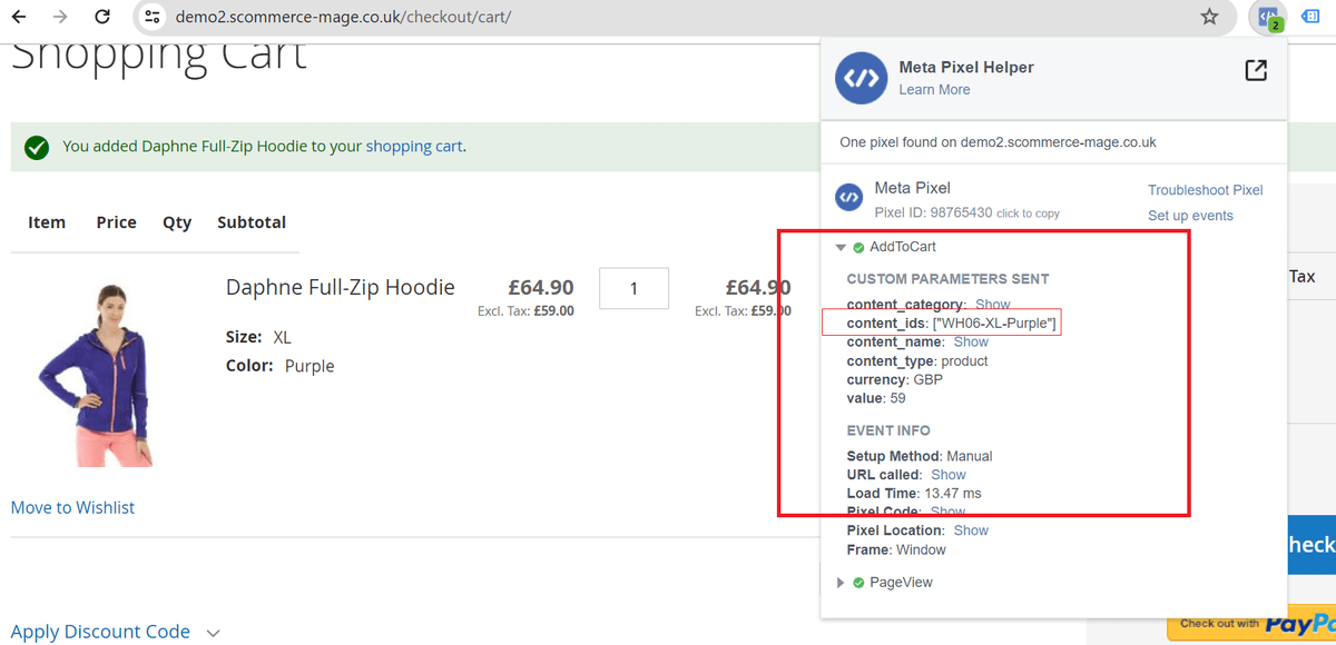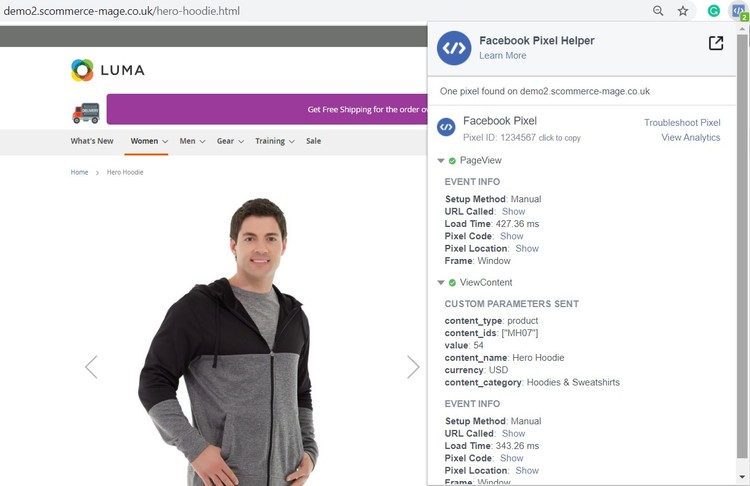 • Facebook Pixel Tag on the Category Page - The extension offers all standard trackers that Facebook uses. When the category page is viewed then it shows page view with event info, which you can see in the below image.