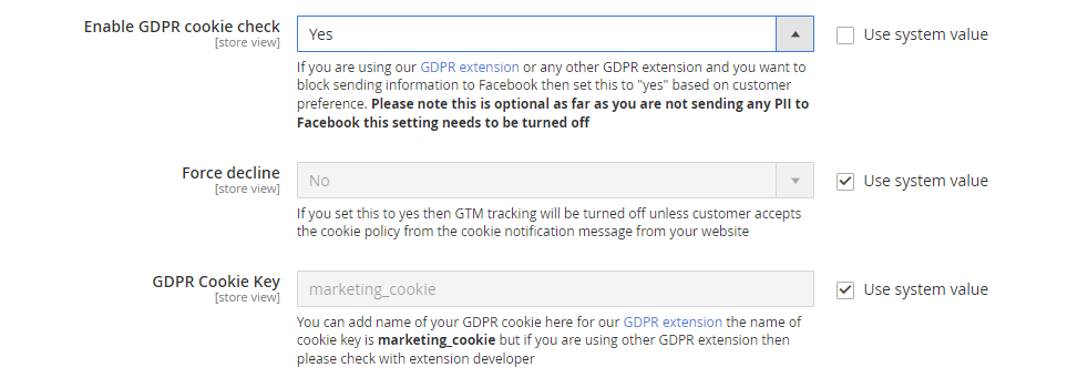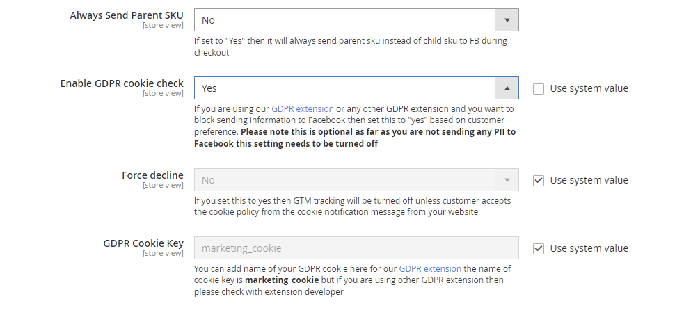 To enable GDPR support go to Stores>Configuration>Scommerce Configuration>Facebook Conversion Tracking and set 'Enable GDPR cookie check' to 'Yes' then set 'Force decline' to 'Yes' and provide the GDPR cookie name in the 'GDPR Cookie Key' inputbox. If you are using our GDPR module then the cookie name is 'marketing_cookie' but if you are using other GDPR extension then please check with extension developer. Once the setting is complete unless the customer accepts the cookie the facebook tracking won't fire.
