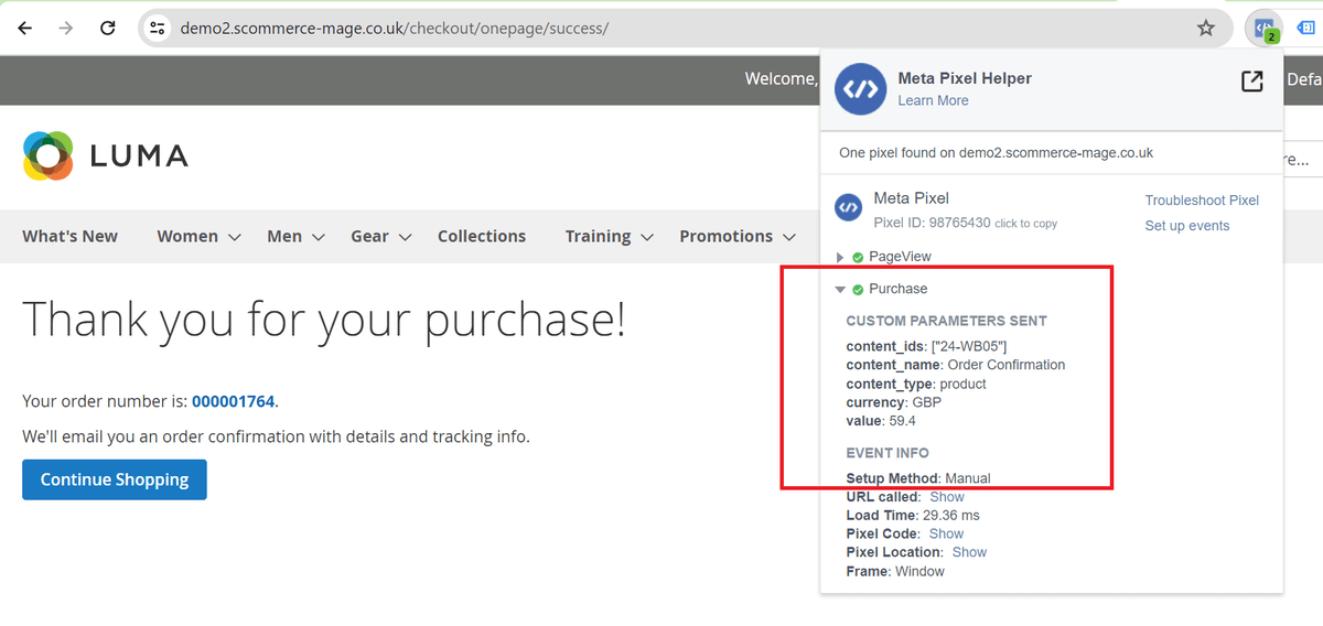 • Facebook Pixel Tag on the Success Page - When a purchase is made or checkout flow is completed, e.g. landing on thank you/success page, provides detailed order information such as Order Value and Cart Items.