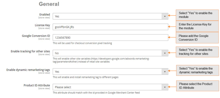 • Dynamic Remarketing Tag/Code Snippets with Product Details- In the code snippet you can see the product details with Product ID and Google conversion id. You can select Product Id attribute from Admin > Stores > Configuration > Scommerce Configuration > Google Remarketing Tag > Product Id attribute - Select "SKU".
