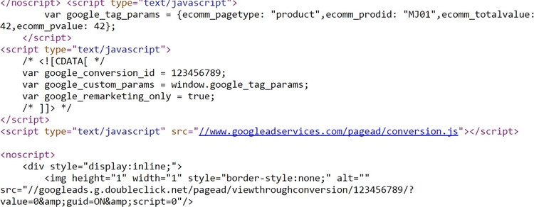 • Dynamic Remarketing Tag, Code Snippets on the Homepage - To view remarketing tag and code snippets go to Homepage > View Source . In the below image you can see the conversion ID and Custom variable. You can add conversion Id from Admin > Stores > Configuration > Scommerce Configuration > Google Remarketing Tag > Google Conversion Id.