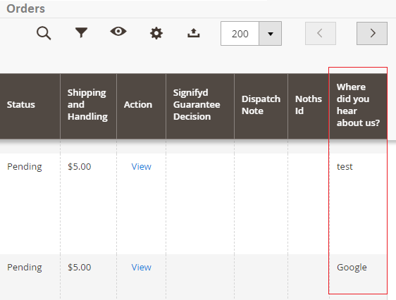 - Selected WDYHAU Option in Orders Grid - You can see the selected "Where did you hear about us?" option at Admin > Sales > Orders grid.
