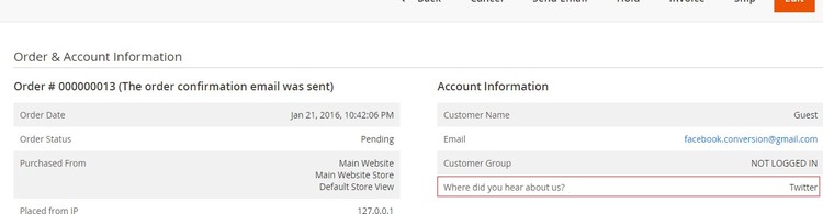- WDYHAU Details on the Sales Order View Page - The selected WDYHAU option will be shown on order view page under "Account Information" section from Admin > Sales > Select Order > View.