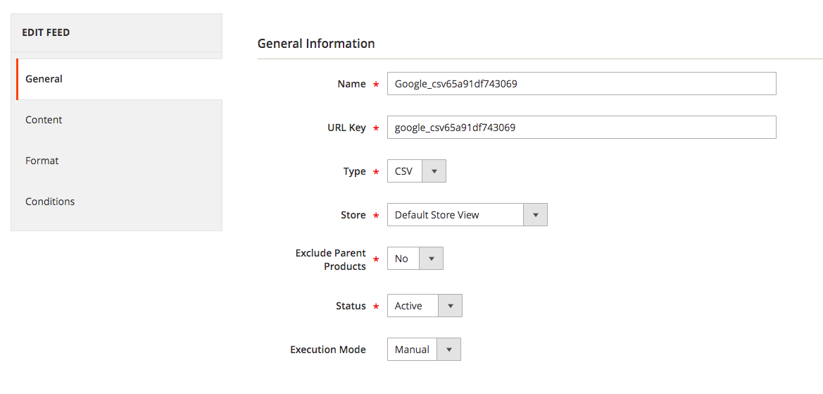 The general tab contains all the general settings such as Name of the feed, URL key, type of feed, store, status, and execution mode.