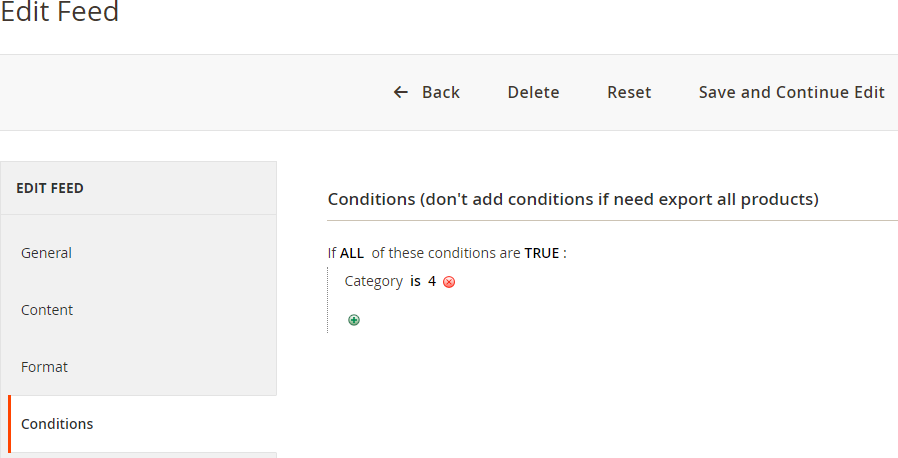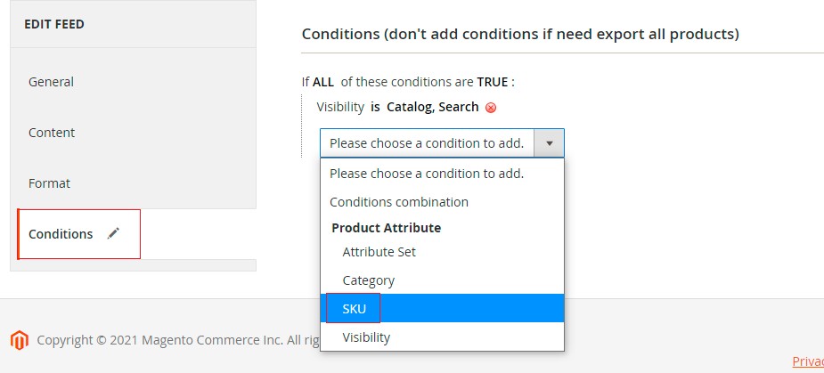 The conditions tab allows you to add custom conditions specific to the feed. For instance, you can apply a condition to generate the feed for only one product by referring to its specific SKU. You can also apply several other conditions from the drop-down list.\