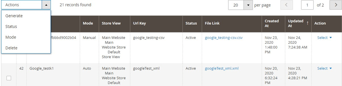 You can create/manage/edit data feeds from Admin > Scommerce > Manage feed list > Click "Add Feed", it redirects on Edit Feed page which contains all the settings required to create a new feed. You can do any custom adjustments while creating a feed or you can do them later. You will find an ACTIONS drop-down on the top left of the list. It contains the following option: -