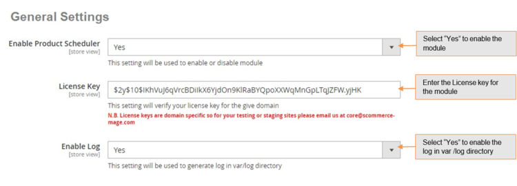 • License Key – Please add the license for the extension which is provided in the order confirmation email. Please note license keys are site URL specific. If you require license keys for dev/staging sites then please email us at support@scommerce-mage.com.