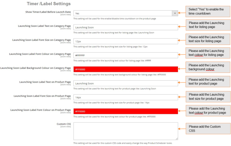 • Launching Soon Label Font Colour on Product Page – This is a text box. This option will only show if "Show timer/label before launch date" is set to yes. The user can enter the text colour for the launching soon label text on product page. Default colour should be #FF0000.