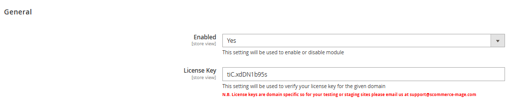 - License Key – Please add the license for the extension which is provided in the order confirmation email. Please note license keys are site URL specific. If you require license keys for dev/staging sites then please email us at support@scommerce-mage.com.