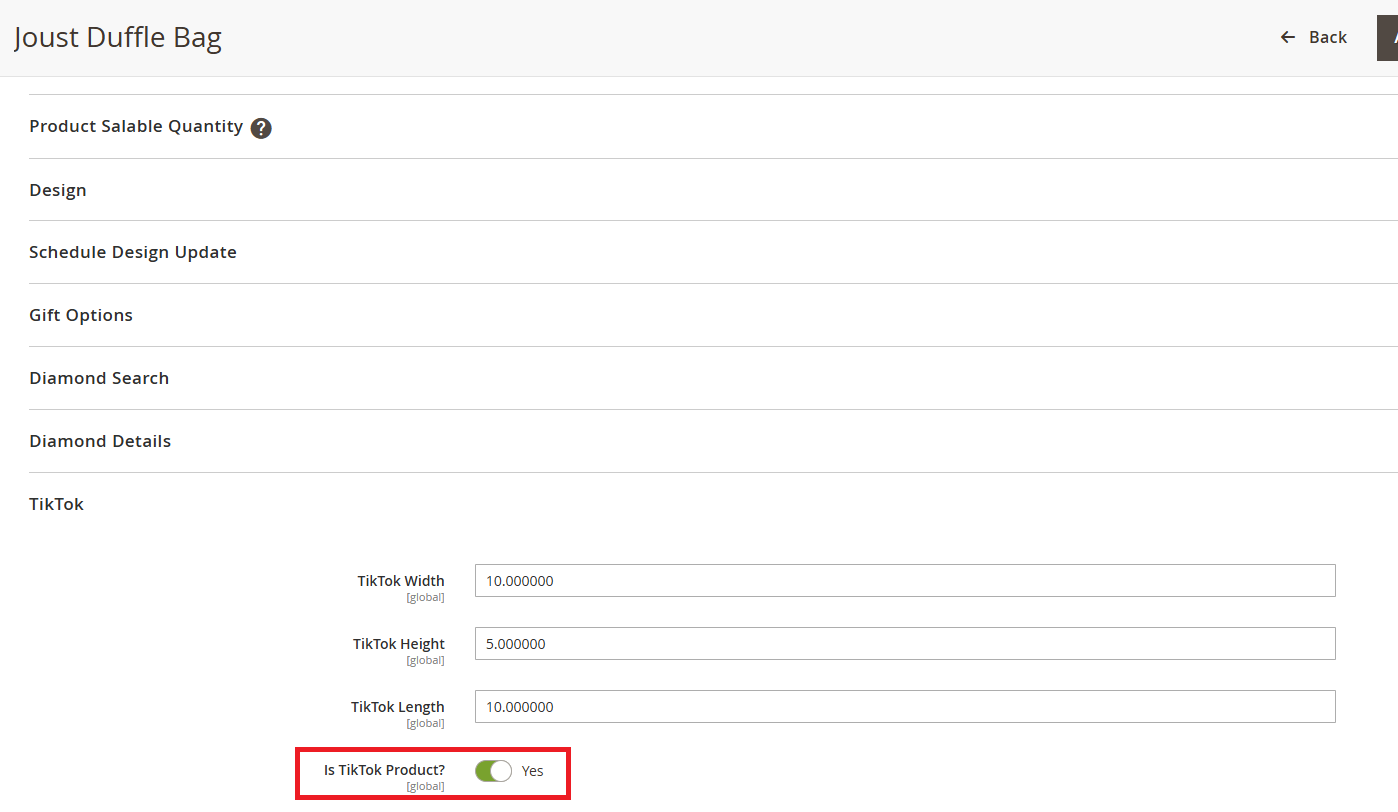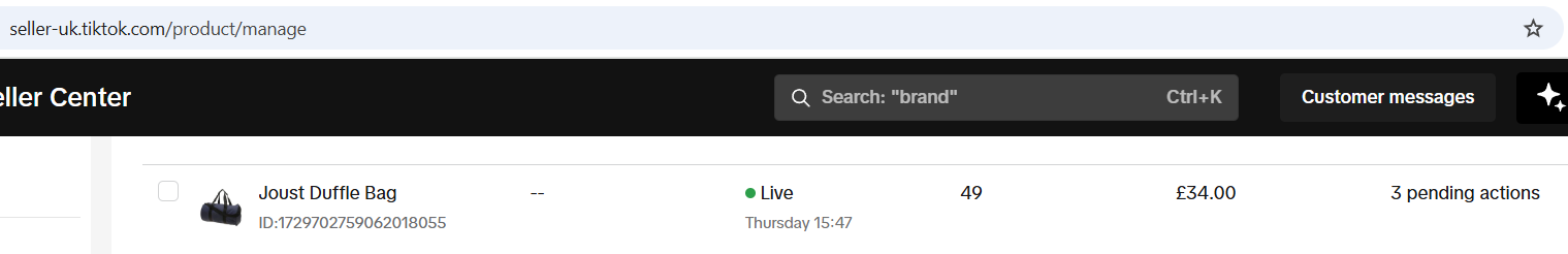 You can see the Joust Duffle Bag product is now created in Tiktok.you can run the product command to show orders in Magento