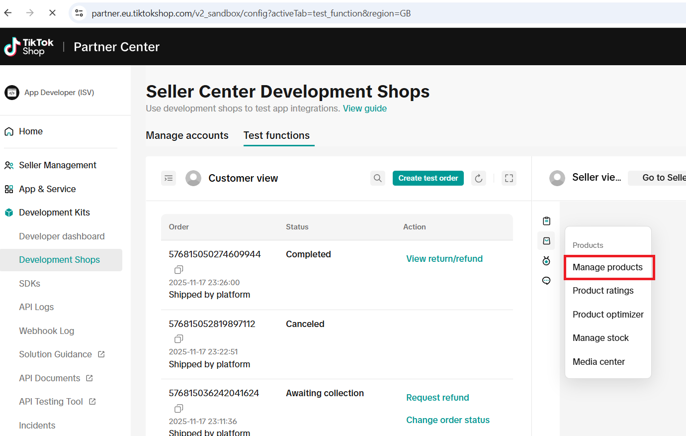 To create products in TikTok, go to App and Services > Development Kits > Development Shops > Manage Accounts