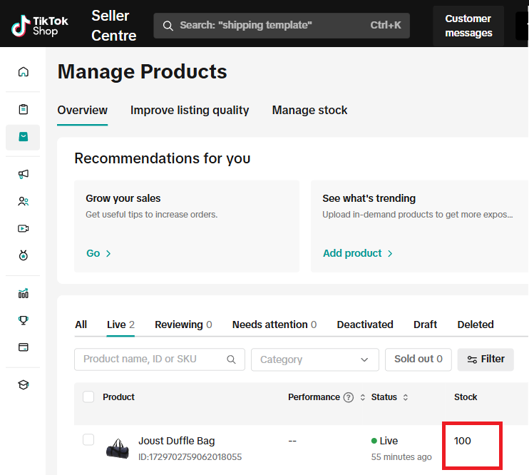 Once the command is executed, the product quantity in TikTok is updated to 100.