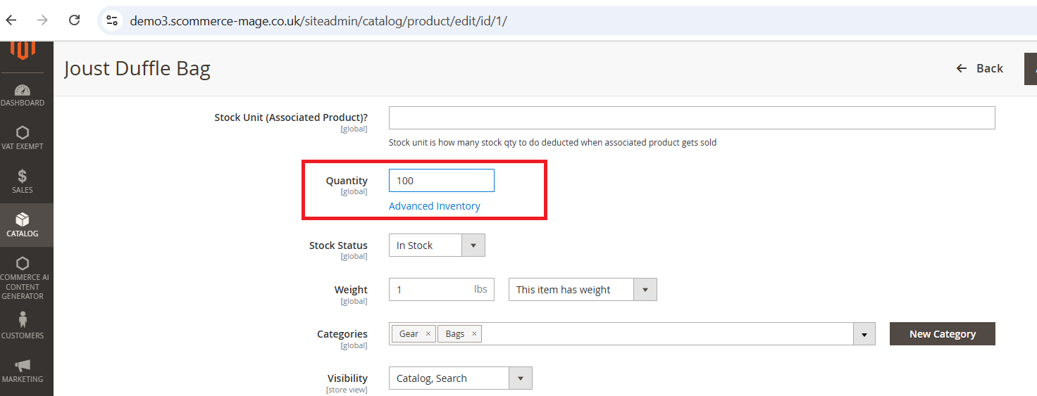 Updated the quantity of the Joust Duffle Bag to 100 in the Admin panel.