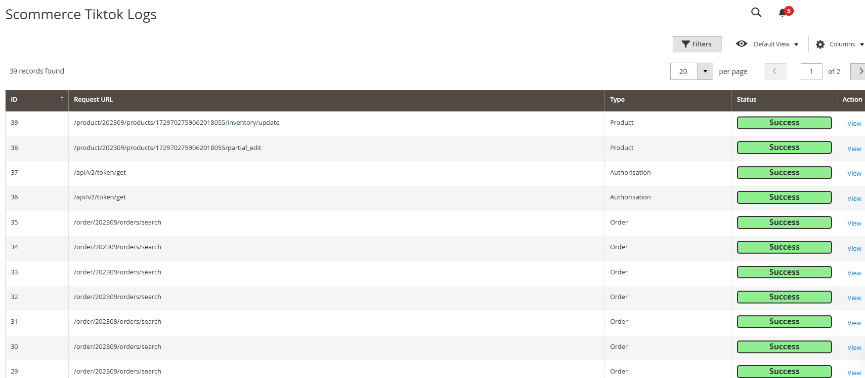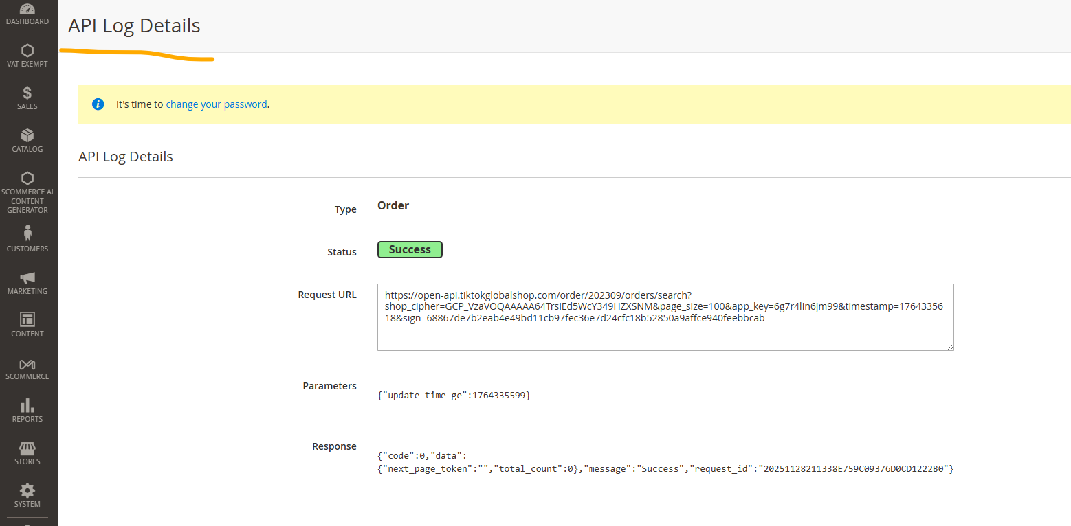 You can check the Scommerce TikTok Logs by navigating to Admin > System > Scommerce TikTok API Logs > Logs Table