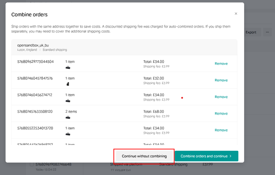 - On the right side, open the Create Label dropdown and select Continue without combining. The shipment will be created.