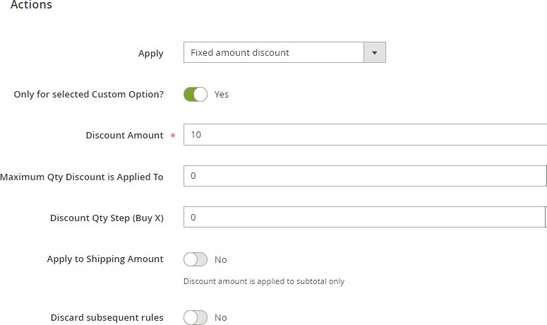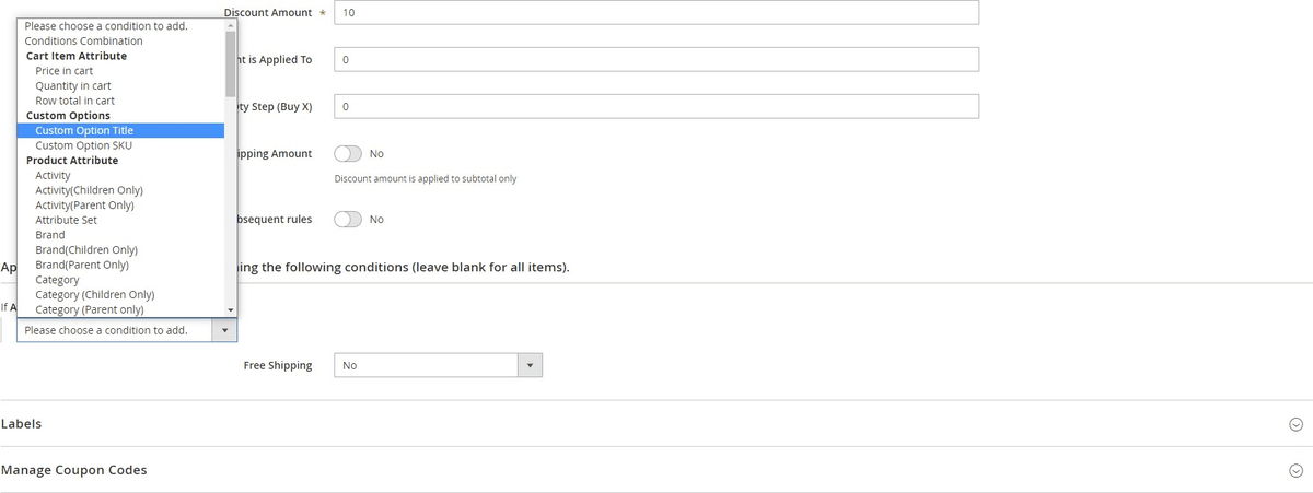 To create cart price rule for specific custom options you will need to add conditions in the Actions Column. For eg: - we have added a condition to apply discount only on the custom option that has custom options title as "Gift Wrap". So now the discount will only be available for the Gift wrap custom option. Similarly, you can create conditions based on custom options SKU and create your custom options discount.