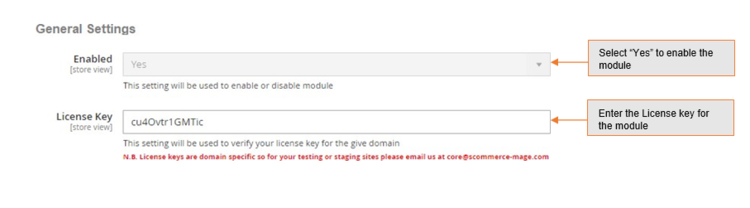 • License Key - Please add the license for the extension which is provided in the order confirmation email. Please note license keys are site URL specific. If you require license keys for dev/staging sites then please email us at support@scommerce-mage.com.