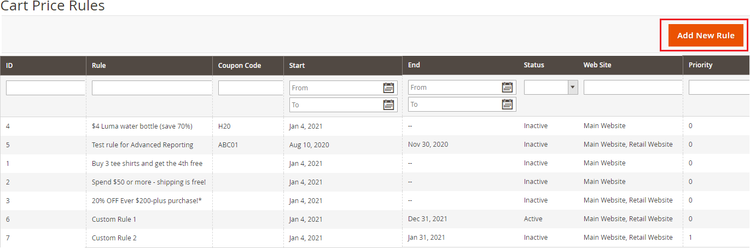 Go to Marketing > Promotions > Cart Price Rules and click on Add New Rule.