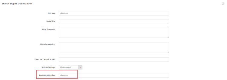 Hreflang Tag on the CMS Page - Enable hreflang on the CMS Pages From Admin > Stores > Configuration > Scommerce Configuration > Hreflang > General Settings > Enable - Select "Yes " > Enable Hreflang Tags For CMS Pages - "Yes". Go to Admin > content > Pages select the about us page for each store view and go into Search Engine Optimization. Put the same identifier if you want interlinking between various languages of the same about us page.