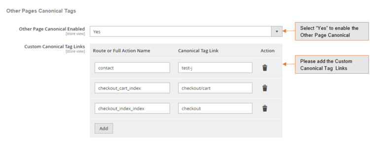 - Other Pages Canonical Tags- You can add canonical tag on the CMS pages from Admin> Stores > Configuration >Scommerce Configuration > Canonical Tags > Other Page Canonical Enabled "Yes" and under Custom Canonical Tag Links click on add and add the full route name of the page for eg:- when visiting the checkout page your URL will look something like http://demo2.scommerce-mage.co.uk/contact/. Here "contact" is your full route name. Lastly, enter the Canonical tag link that you want to send with the URL.