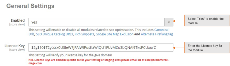 - License Key – Please add the license for the extension which is provided in the order confirmation email. Please note license keys are site URL specific. If you require license keys for dev/staging sites then please email us at support@scommerce-mage.com.