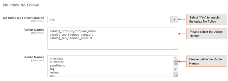 - Action names – Add action names here to add no index, no follow in the head section for specific page. New route name needs to be added in next line.