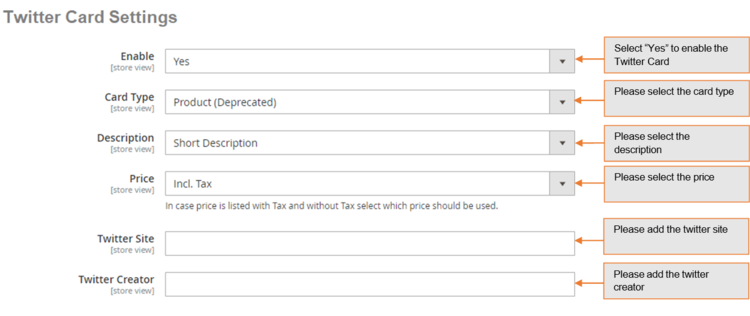 Twitter Card - You can enable Twitter Card from, Admin > Stores > Configuration > Scommerce Configuration > Rich Snippet >Twitter Card Settings > Enable - "Yes".