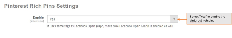 - Enable – Set "Yes" to enable Pinterest Rich Pins . It uses same tags as Facebook open graph, make sure Facebook Open graph is enabled as well.