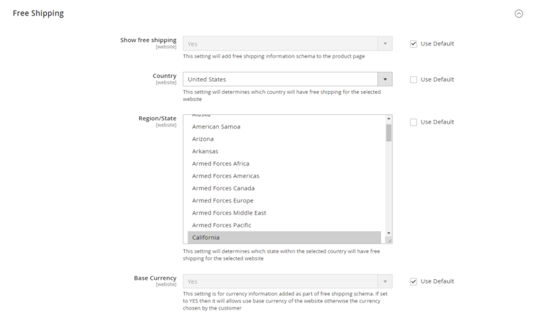 - Region/State – It determines which state within the selected country will have free shipping for the selected website