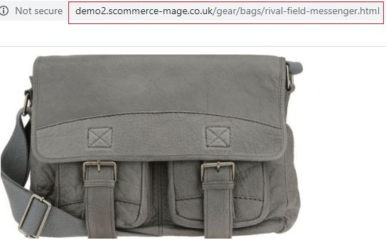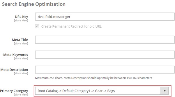 - Product Page Unique URL - You can assign primary category to any product from Admin > Catalog > Select Product > Search Engine Optimization > Primary Category. In the below image you can see the assigned category of product Rival Field Messenger is "Gear->Bags".