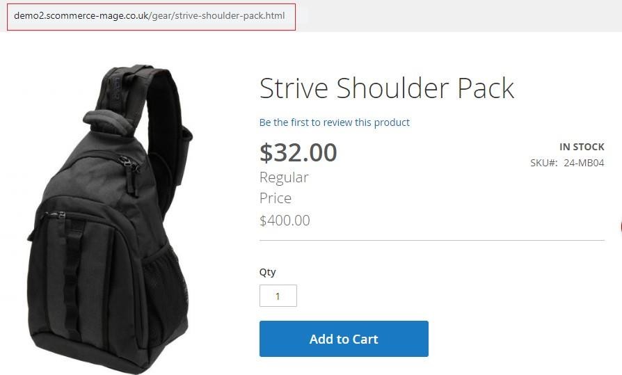 - Search Page / Category Page Unique Catalog Product URL – We have assigned “Strive Shoulder Pack” product to “Gear” Category and the URL stays the same when we access the product from the search or category page.