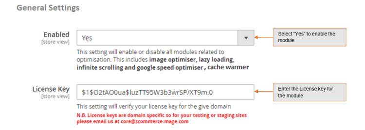 • License Key – Please add the license for the extension which is provided in the order confirmation email. Please note license keys are site URL specific. If you require license keys for dev/staging sites then please email us at support@scommerce-mage.com.