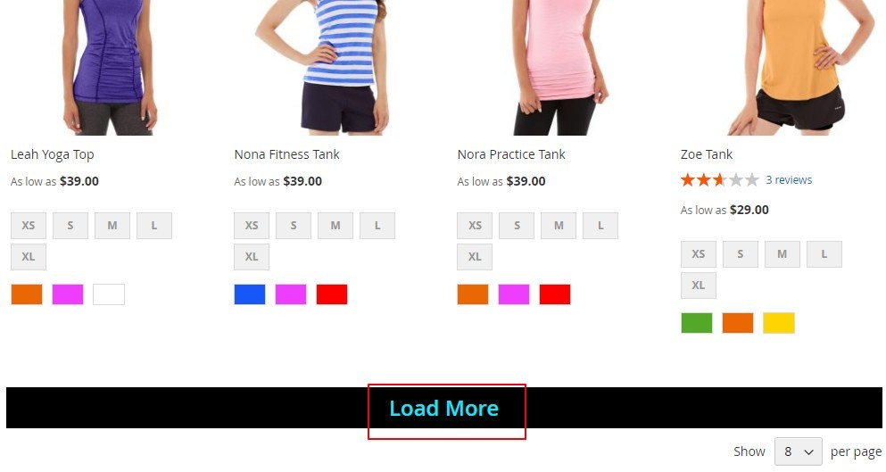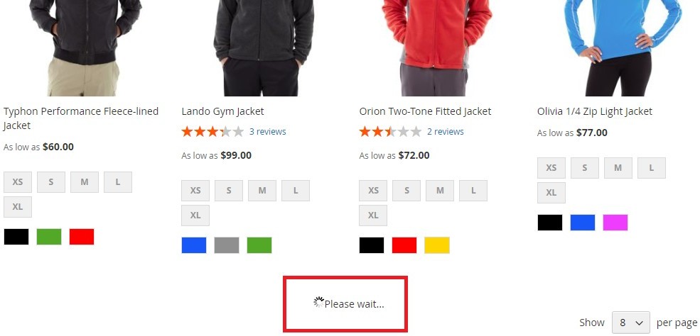 • Infinite Scroll with Auto Loading on the Category and Search Pages – You can implement auto loading on the category and search pages by selecting the option "Load Automatically" from Admin > Stores > Configuration > Infinite Scrolling > Loading Type.