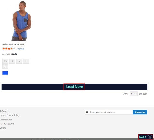 • Infinite Scroll with ‘Load More Button’ and Page Number – To display Load More Button with page numbers on category and search pages first select option “Load with Button” from Admin > Stores > Configuration > Infinite Scrolling > Loading Type and then select “Yes “ from Admin > Stores > Configuration > Infinite Scrolling > Display Page Numbers. This will display page numbers with Load More Button as shown in screen grab below.